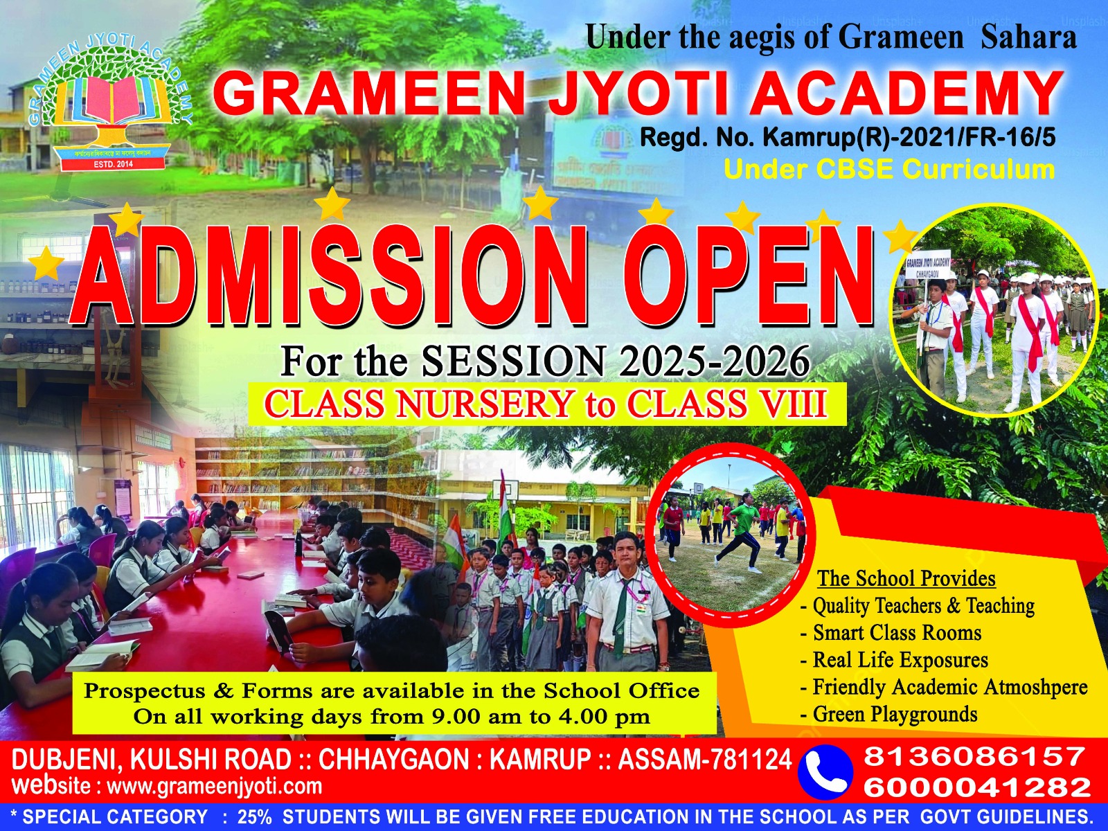 Grameen Sahara set up GJAto aim to harness the immense potential of the students by imparting true knowledge, right experiences and there by transforming them into dynamic forces for social change and development. This school builds a community which promotes the importance of shared values, where we seek to encourage a real enthusiasm for learning and a spirit for enquiry. The school was founded at the aegis of Grameen Sahara Ngo that has endeavoured to address multiple social and economic issues in the region. It is situated at a distance of 25 km west from Guwahati Airport. GJA firmly based in secular principles is a happy place, vibrant and forward-looking school in the region. The school’s commitment is to provide the very best all-round education here. At the core our belief is that every individual has talents to be discovered and nurtured and that our challenge is to develop this while preparing our students for their future beyond school.